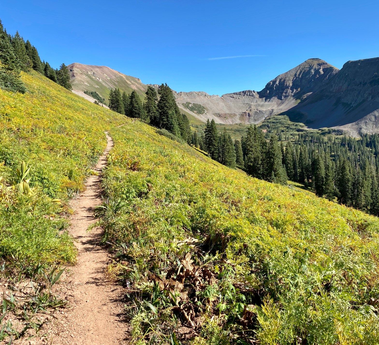 Getting There: From Durango, take US-160 west to County Road 24 on the right. Head up hill into the canyon. The drive up LaPlata Canyon is long and may be a challenge. It requires 4WD and high clearance for a couple of points on the road up to the trailhead. We have seen Subarus at the top but nothing less. After passing several campgrounds and LaPlata City (an almost ghost town from the gold mining days which is still privately owned), you’ll likely see some cattle along the road, ruins from mining buildings, and a turn-off or two to operational mines. Near the end of the road, you’ll come to a bowl, surrounded by Cumberland Mountain and Snowstorm Peak. You’ll find lots of artifacts from the mines that operated here. Hang a left and stay on the road to go uphill to the Trailhead. You are miles and hours from civilization, but there is parking for several cars on this saddle, signage and cell service (and even a couple Pokestops for PokemonGo players!) We have also seen lower-clearance vehicles at the trailhead, but it depends on the road condition which varies from year to year.