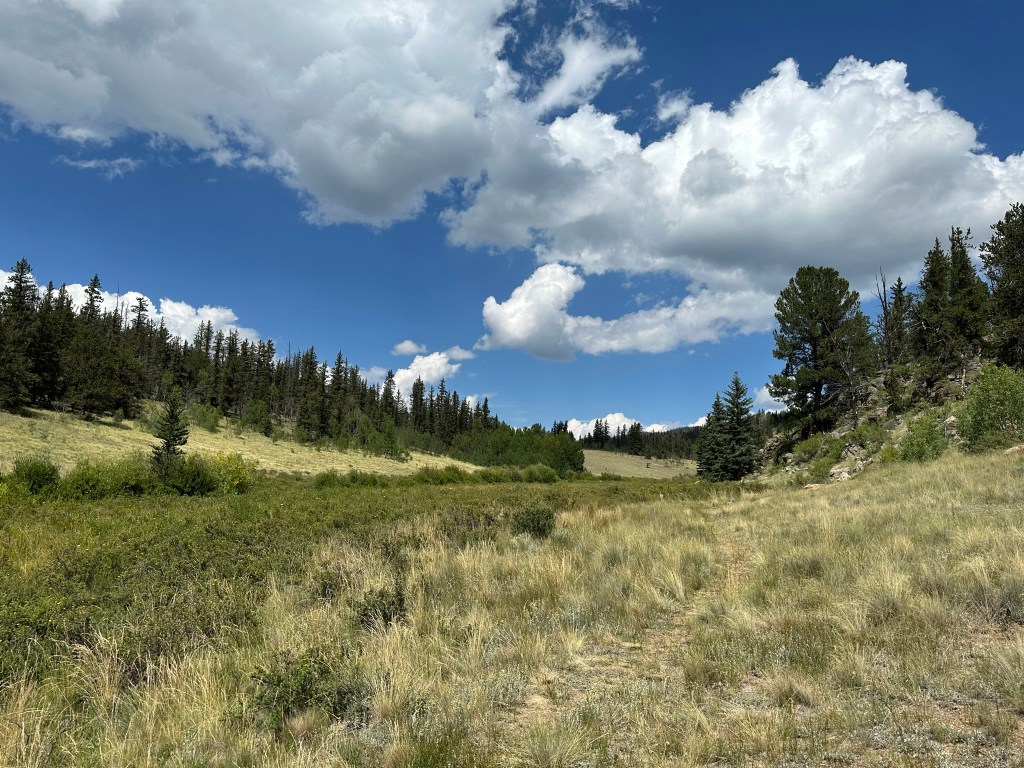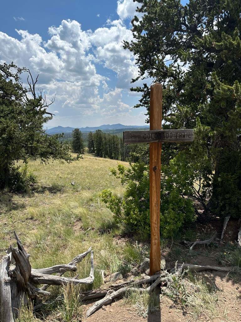 At the 2-mile mark you will come across an old wooden sign that simply says “Colorado Trail”. Here is your first view of South Park, with mountain peaks in the distance. Below you might see a glimpse of Lost Park Road, which you drove to get to the trailhead but otherwise there is very little evidence of humans in this grand view. Continue hiking another half mile uphill, across the crest of a high point, and through some more forest. Pause to enjoy the grand views as you cover this half mile of trail. We hiked downhill to an old road spur, but it’s really not logical to do this unless it is your intention to make this a longer hike and keep going towards Kenosha Pass, perhaps to the next high point another mile ahead.
