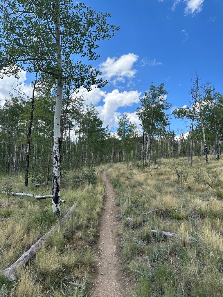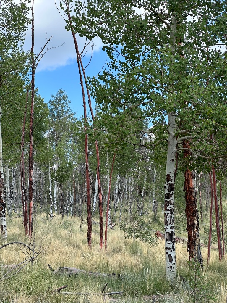 The abundance of aspen on this trail suggests that it is an excellent choice during the autumn when the leaves are changing (usually between about September 22 and October 3). At about the 1.8-mile mark of the hike, notice the tree trunks to your right that are reddish. This indicates an area where there was a wildfire and red tinted fire retardants were dumped in this area to douse the fire. By the looks of the aspen that have grown since then, that fire was at least 20 years ago.
